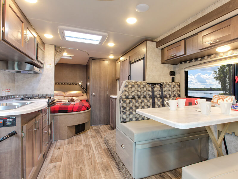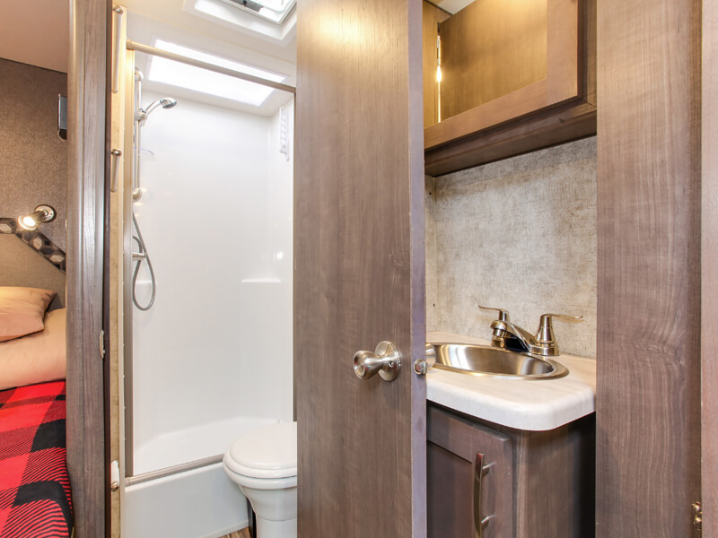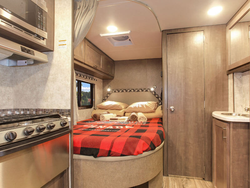 Das Fahrzeug verfügt über eine komfortable Schlafgelegenheit, eine voll ausgestattete Küche mit Herd, Kühlschrank und Mikrowelle sowie ein Bad mit Dusche und Toilette. Die geräumige Sitzgruppe und zusätzliche Staumöglichkeiten sorgen für Bequemlichkeit während der Reise. Trotz der Größe bleibt das Motorhome gut manövrierbar und eignet sich perfekt für Paare oder kleine Familien, die Kanada komfortabel und flexibel entdecken möchten.
